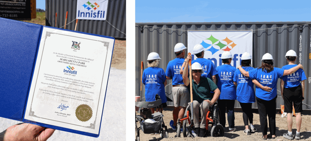 On the left, a close-up shot of a commemorative certificate issued by MPP Andrea Khanjin, celebrating the groundbreaking of Innisfil’s first fully inclusive playground, Margaretta Park, named in recognition of Margaretta Peppé-Belanger.