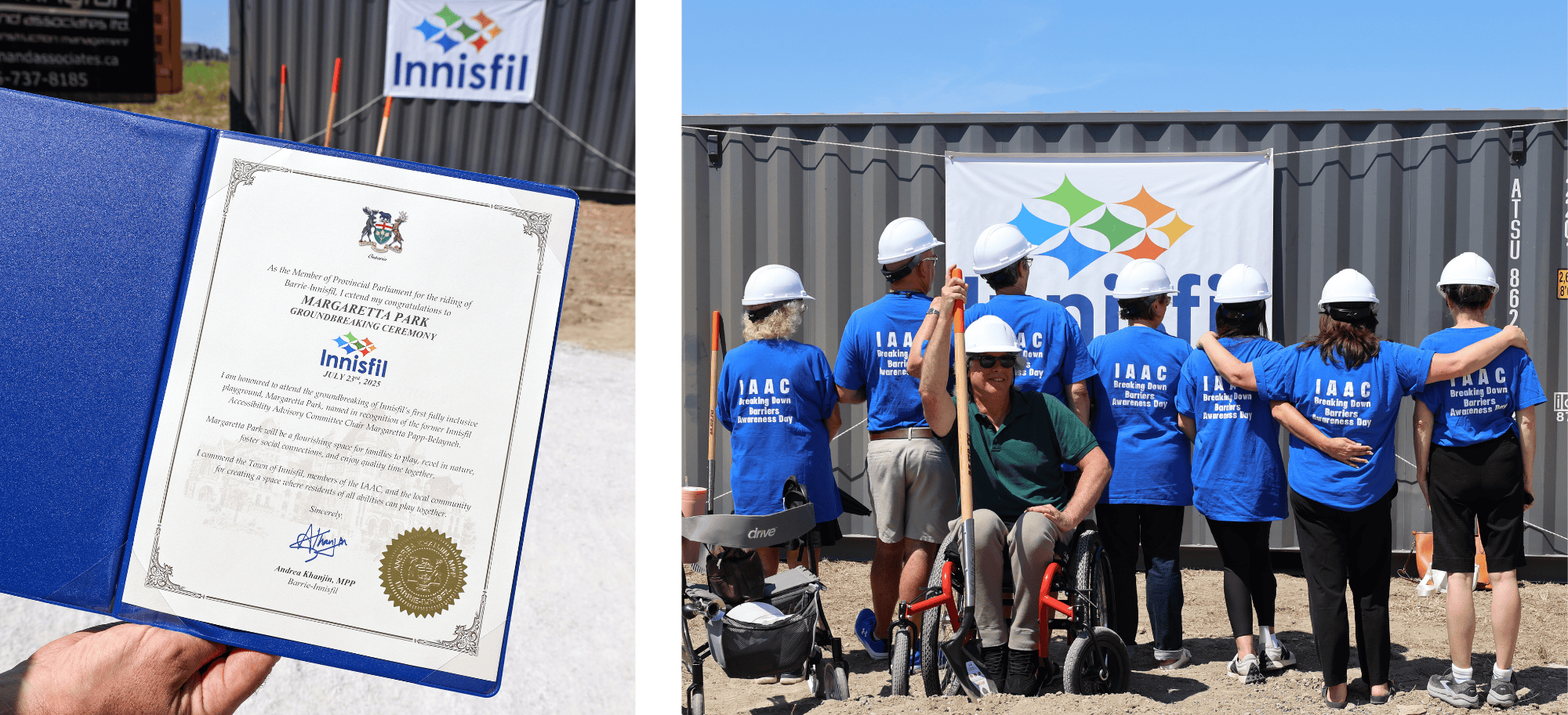 On the right, nine members of the Innisfil Accessibility Advisory Committee (IAAC), seen from behind, stand in front of a grey shipping container with their arms around each other. They wear matching blue shirts reading “IAAC Breaking Down Barriers Awareness Day” and white construction helmets. One person in a wheelchair sits in front, smiling and holding a shovel.