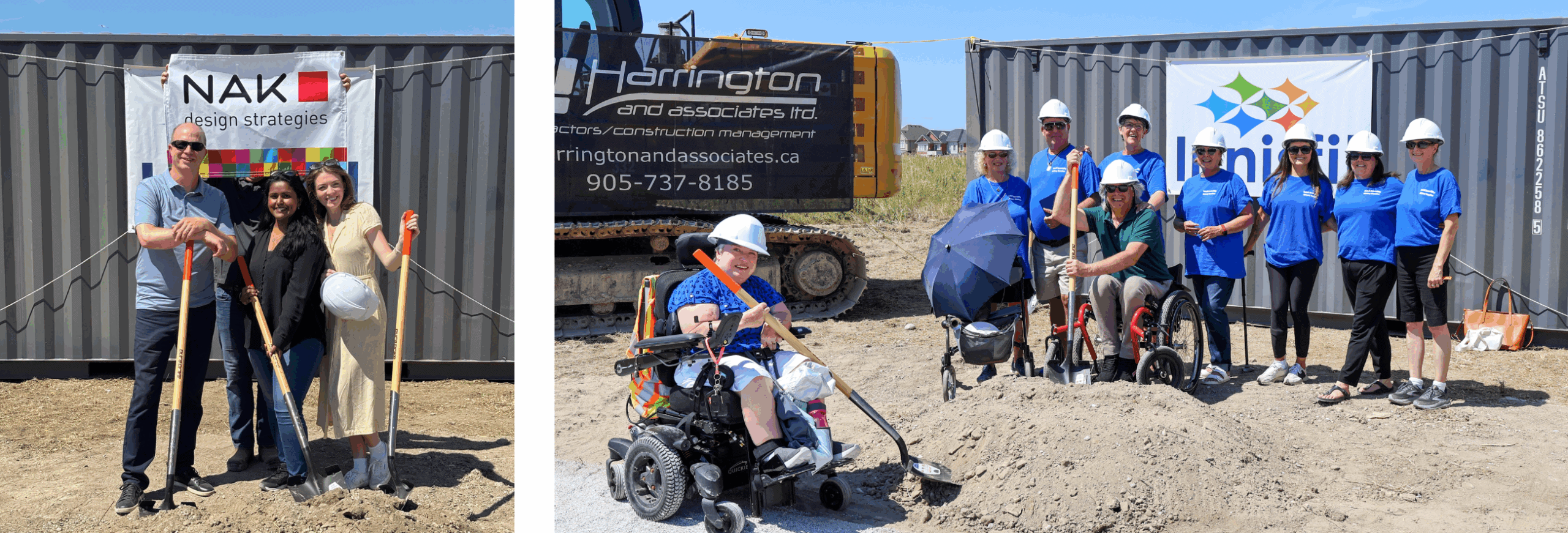 On the right, nine members of the Innisfil Accessibility Advisory Committee (IAAC) pose together in front of another container with the town’s “Innisfil” logo banner. The group includes two individuals using wheelchairs, and several others wearing blue shirts and hard hats. One person holds an umbrella for shade, and others hold shovels, celebrating the start of construction.