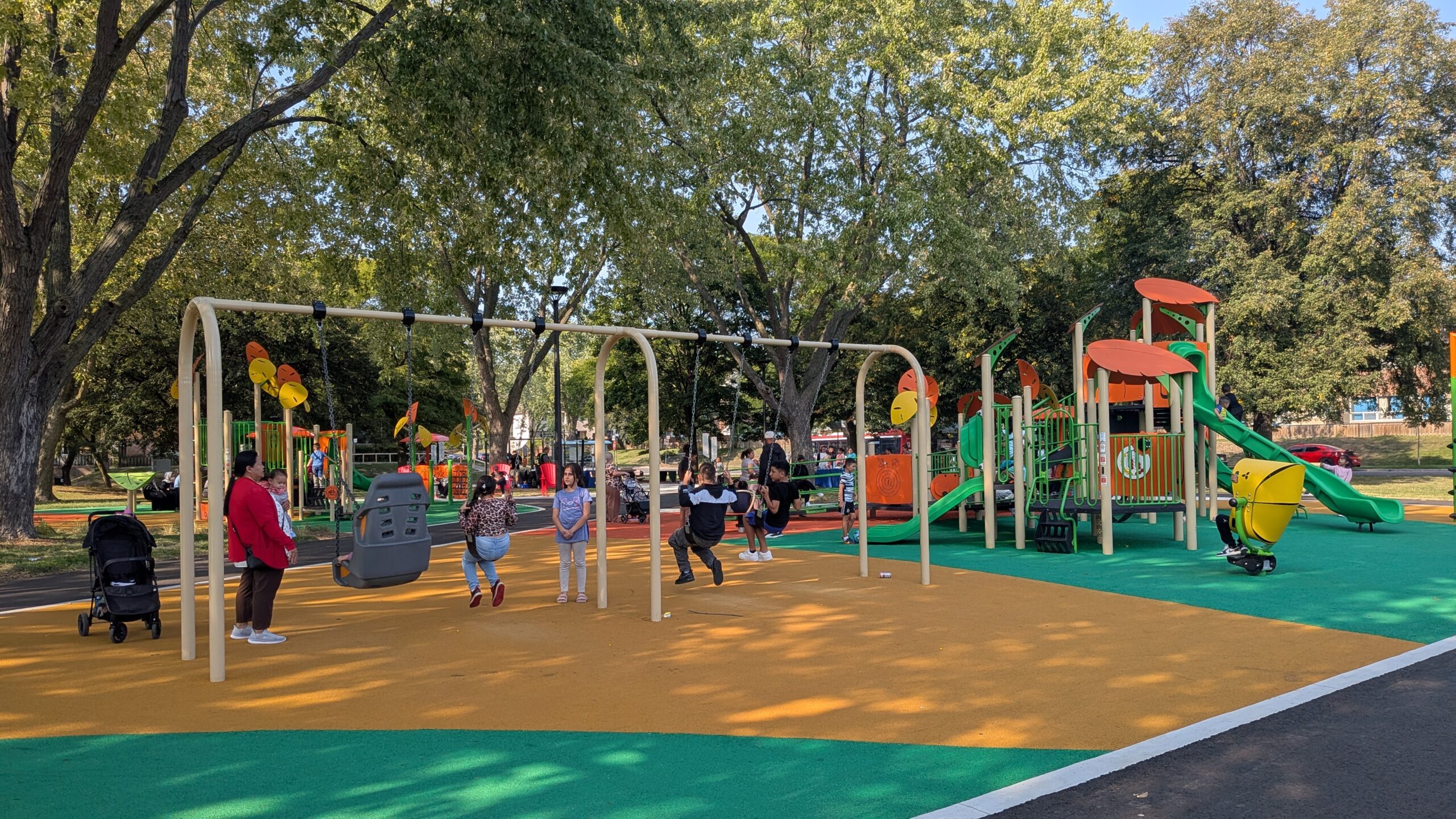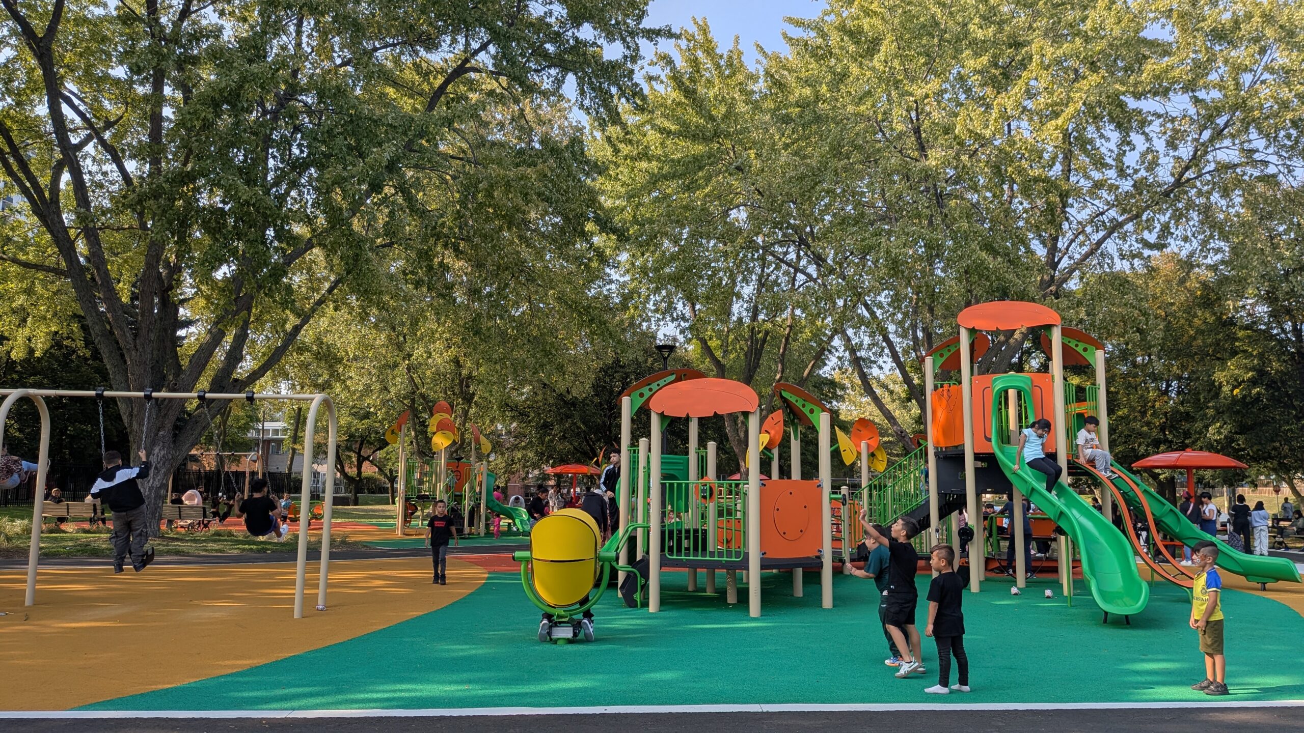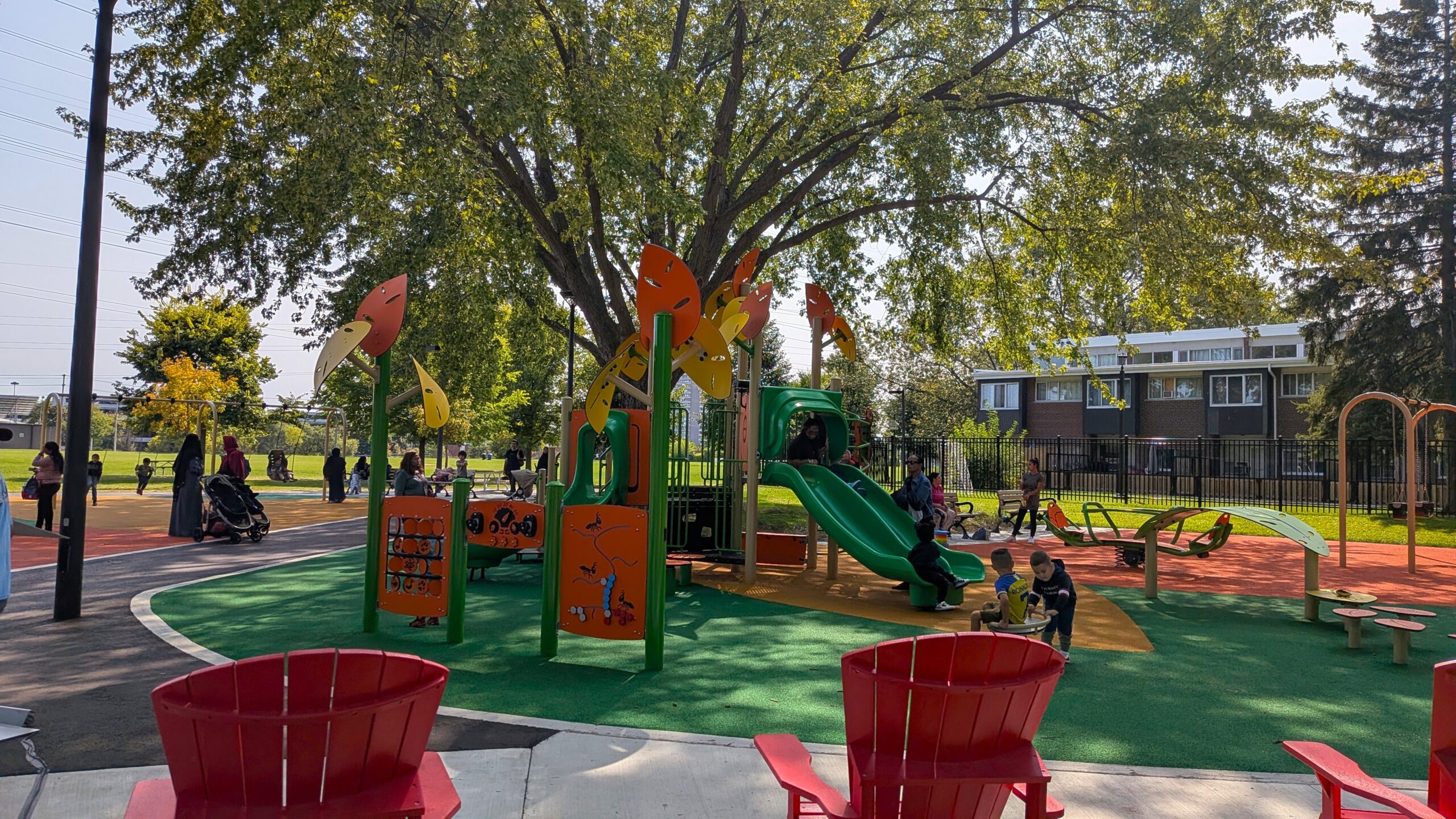 Nestled in one of Toronto’s most diverse and underserved neighbourhoods, the redeveloped playground transformed a well-used community green space into a fully accessible, inclusive destination for play and gathering. The design centres on equity and everyday delight: a colourful, whimsical play structure anchors the space, while a generous shade structure and a mix of lounge chairs, benches, and café-style tables invite caregivers, teens, and older adults to linger comfortably.